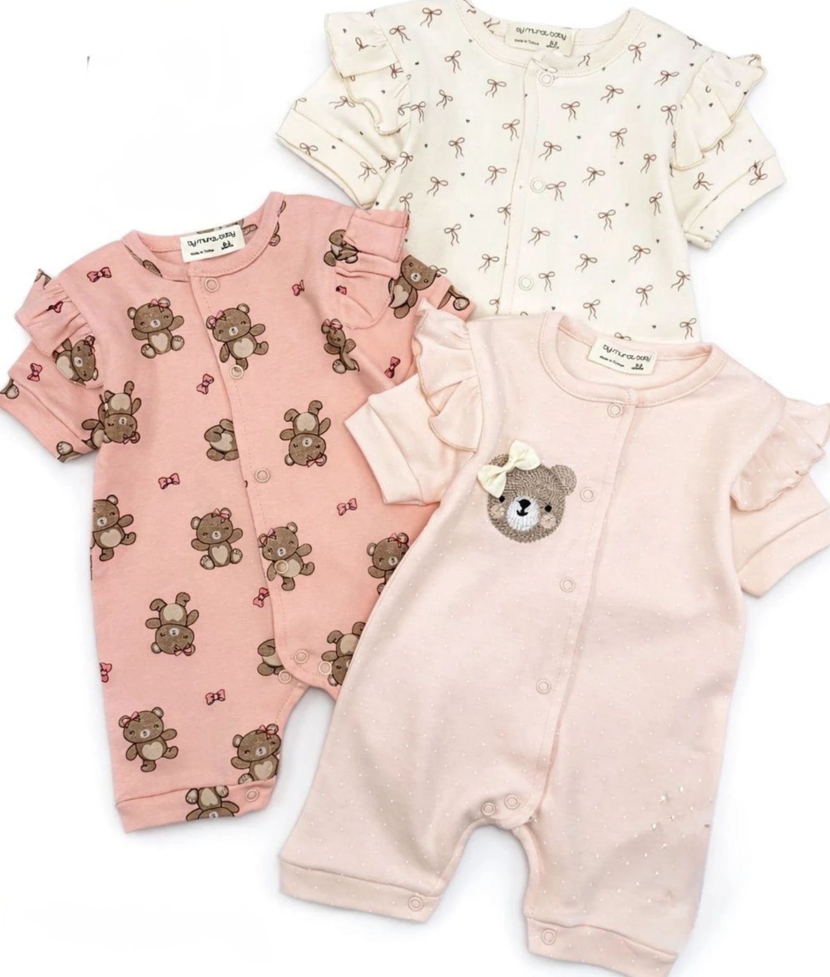 Ayıcık detaylı kolları fırfırlı üçlü kısa kollu tulum seti