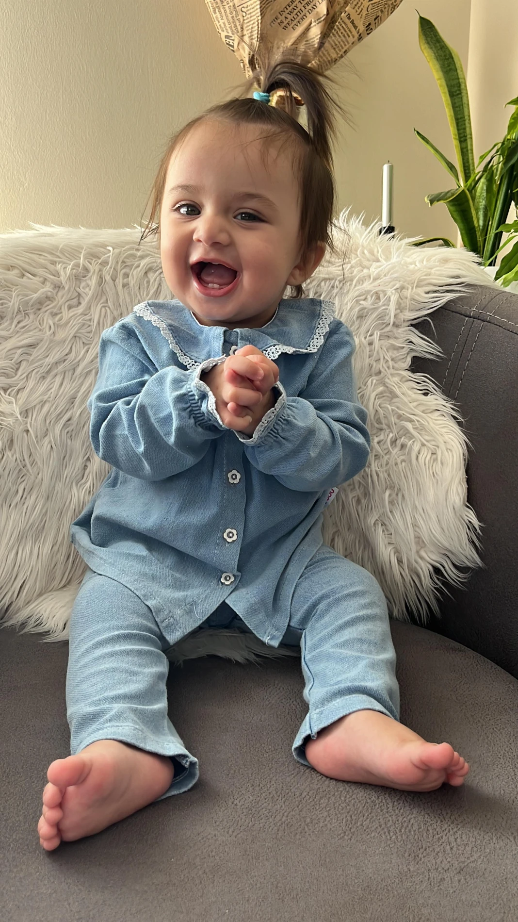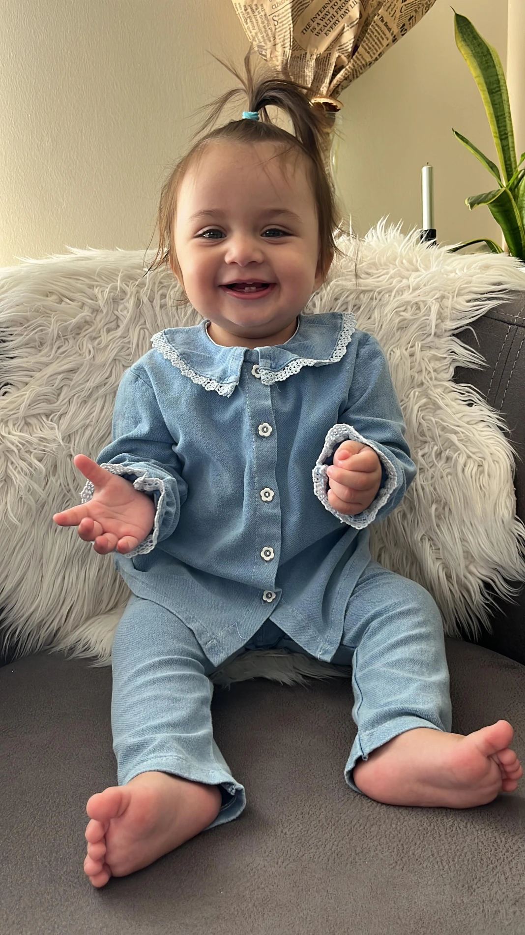 Önden düğmeli bebe yaka denim takım