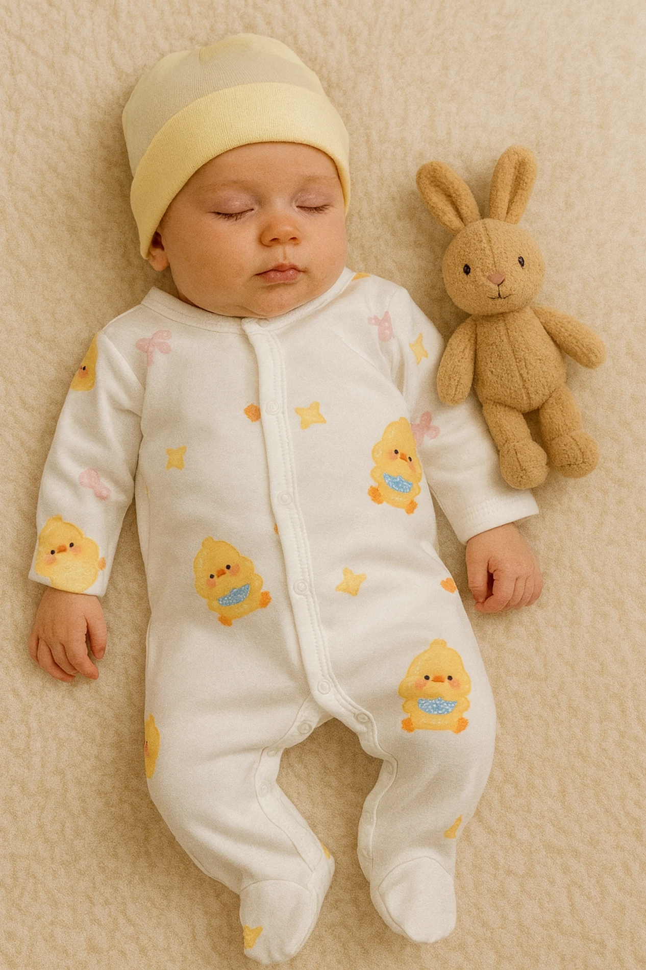 • Süslü civciv desenli mevsimlik tulum ( şapkası dahil değildir)